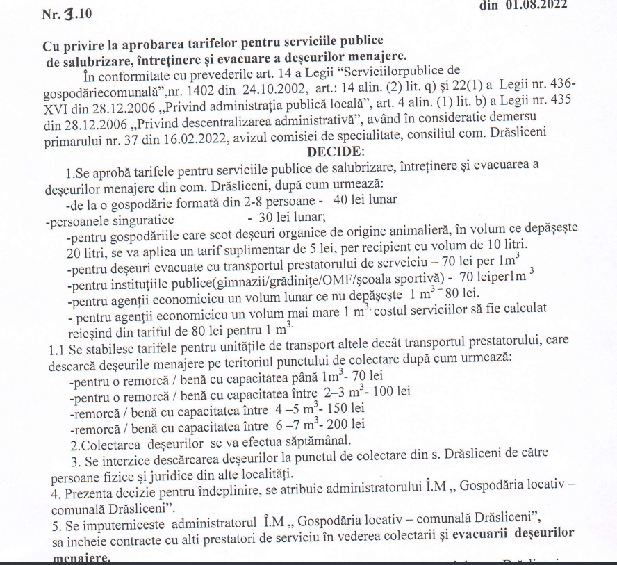 Luni 1 august 2022 consilierii locali urmează să examineze proiectul de decizie „Cu privire la aprobarea tarifelor pentru serviciile publice de salubrizare, întreținere și evacuare a deșeurilor menajere” , care prevede și interzicerea transportării deșeurilor la punctul de colectare din s. Drasliceni de către persoane fizice și juridice din alte localități. Administratorul Î.M. „Gospodăria locativ-comunală Drăsliceni”, dl Vasile Ciutac se împuternicește să încheie contracte cu alți prestatori de servicii în vederea colectării și evacuării deșeurilor menajere.