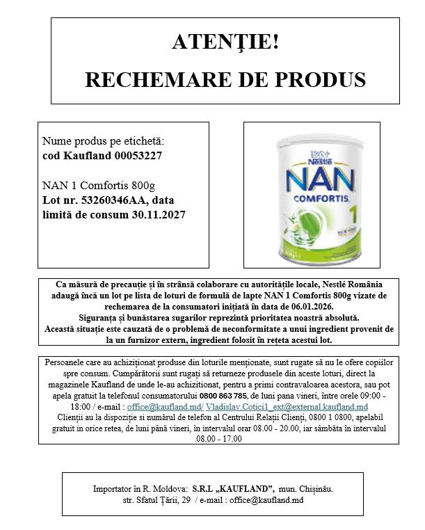Un lot de formulă de lapte praf pentru sugari NAN 1 Comfortis 800 g este rechemat de urgență din magazinele Kaufland, ca măsură de precauție, în urma unei neconformități identificate la un ingredient provenit de la un furnizor extern.