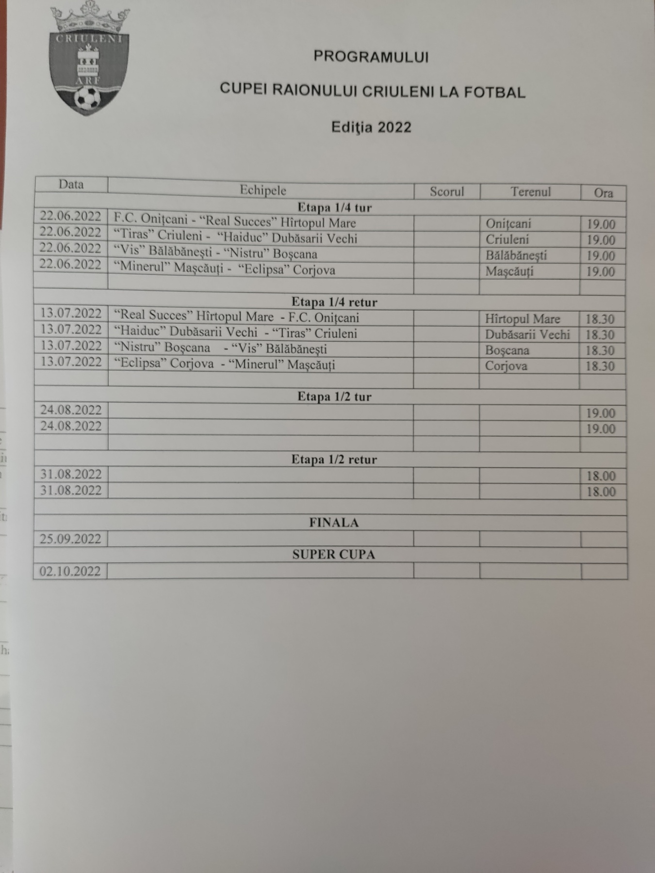Miercuri, 22 iunie pe stadionul din Criuleni s-au întâlnit echipele FC TIRAS Criuleni și ”Haiduc” Dubăsari Vechi. Vântul puternic nu a fost un impediment pentru microbiști. S-a jucat piept la piept, însă victoria a fost de partea criulenenilor. Ianoș Raiu a marcat două goluri și Damian Buzilă a mai adaugat unul în poarta ”Haiduc”-ului și astfel partida s-a încheiat cu scorul de 3 la 0.