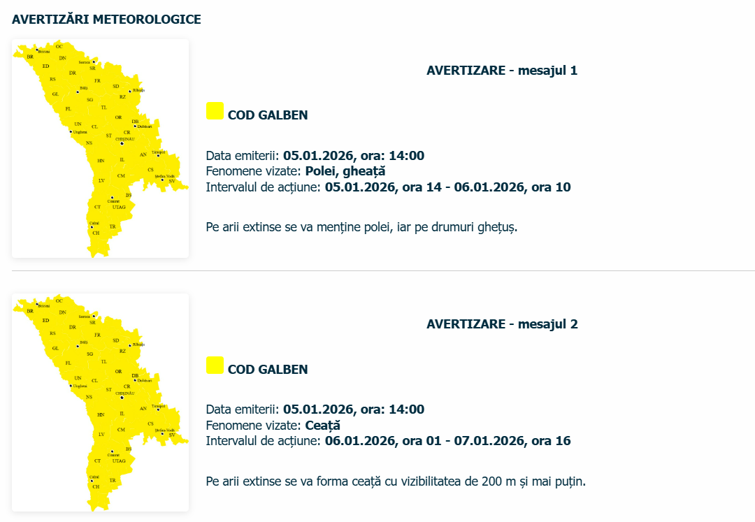 Republica Moldova se află sub incidența a două avertizări meteorologice Cod Galben, emise pentru următoarele zile, care vizează fenomene ce pot afecta siguranța circulației și activitățile cotidiene.