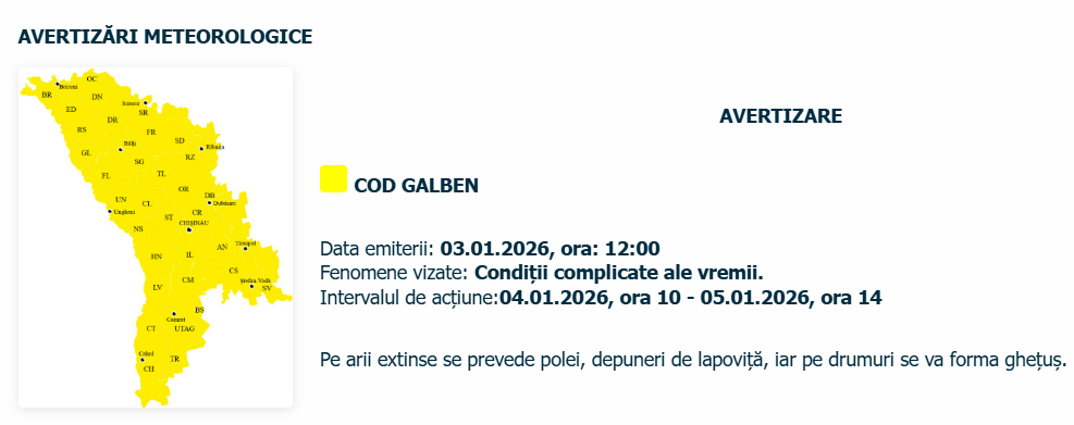 În contextul Codului Galben emis de Serviciul Hidrometeorologic de Stat, care anunță polei, lapoviță și formarea ghețușului pe partea carosabilă, Poliția Națională vine cu un set de recomandări pentru participanții la trafic.