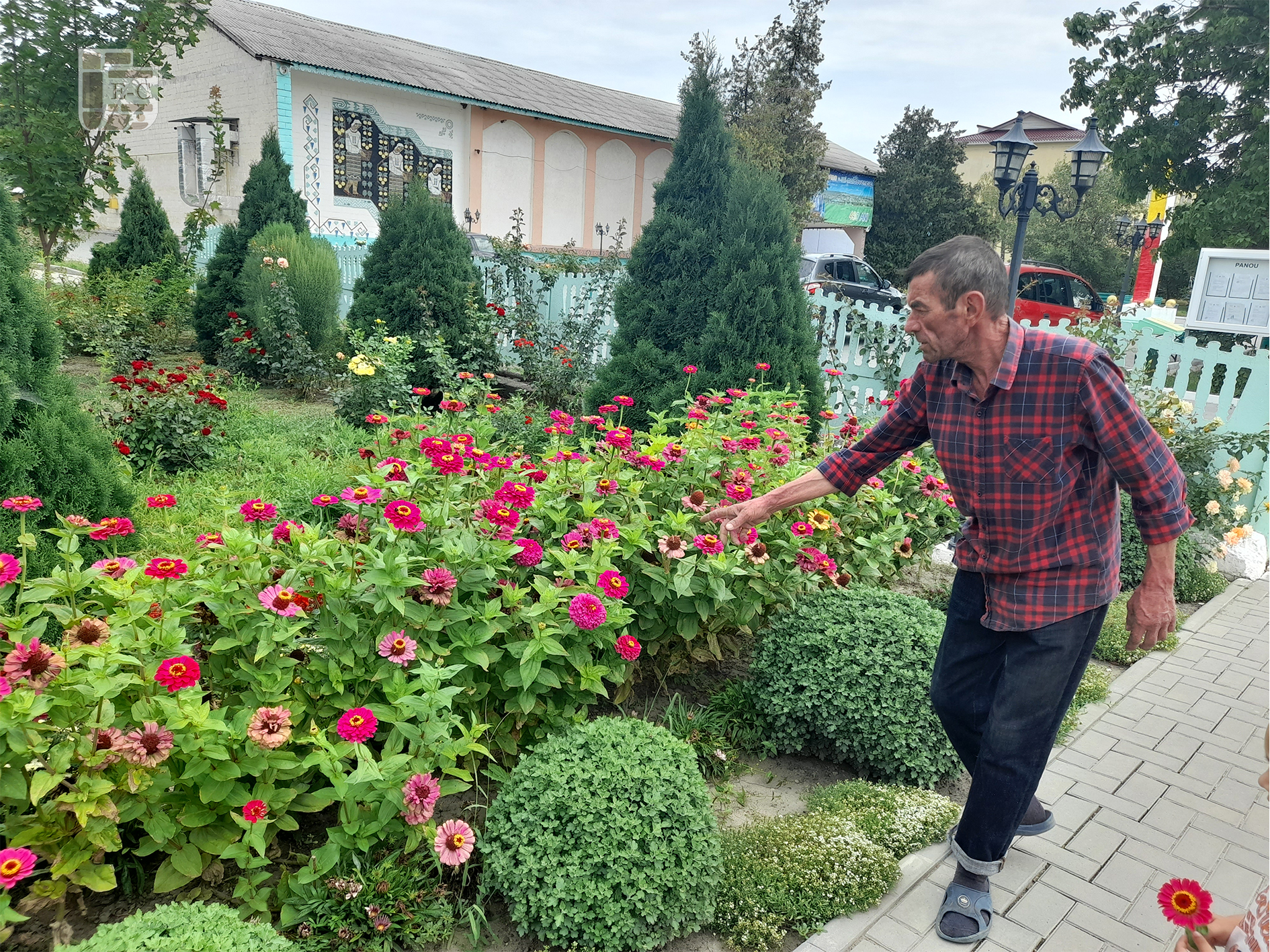Curtea primăriei Boșcana, la mijloc de august, abundă în flori și culori. Grădina de pe ambele părți ale trotuarului bucură ochii vizitatorilor, iar roaba și sapa rezemată de un felinar trădează prezența pe aproape a celui care le îngrijește. La întrebarea cine are grijă de flori și pe cine răsplătesc plantele pentru dragoste cu atâtea nuanțe vii, degetele și privirile se întorc spre grădinarul Valeriu Prodan.