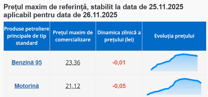 Agenția Națională pentru Reglementare în Energetică (ANRE) a publicat noile prețuri maxime de comercializare pentru produsele petroliere principale de tip standard, valabile pentru 26 noiembrie 2025. Conform datelor oficiale, atât benzina 95, cât și motorina înregistrează o scădere ușoară.