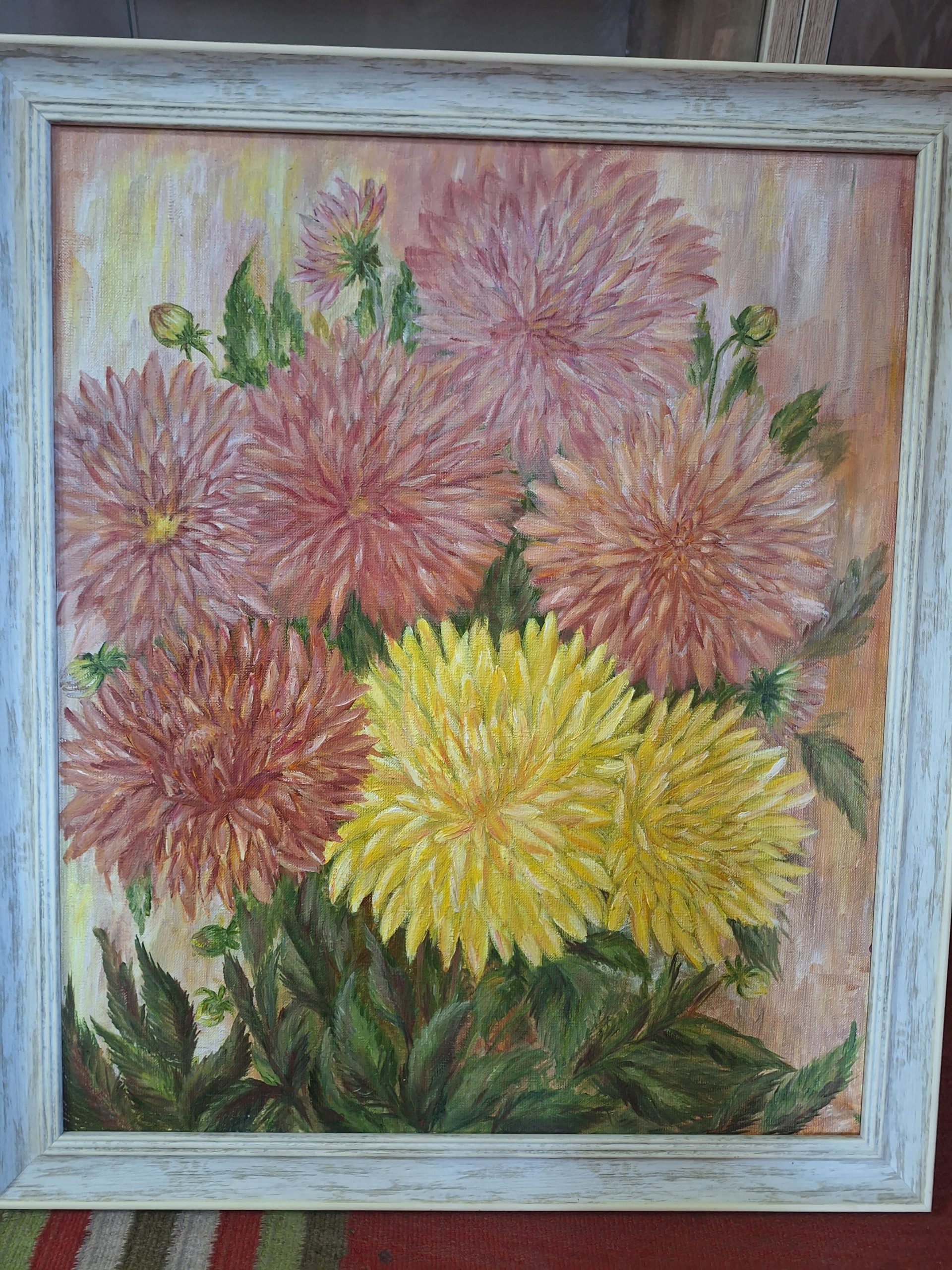 -Am câteva direcții de tapiserie, dar aici prezint o colecție inspirată din motivele covorului tradițional: spicul de grâu, tapiseria „Hodina”, care reprezintă o femeie care se odihnește pe un covor după o zi de muncă, serile de vară, apusurile, teii Chișinăului, motive tradiționale precum „pomul vieții”, motive geometrice. În picturile în ulei pe pânză, pentru că este primăvară, redau florile pe care le găsim practic în fiecare grădină și uneori nu le observăm cât sunt de frumoase: gheorghine, astre, dumitrițe, crăițe, levănțică. Fiecare lucrare în parte are un sens profund.