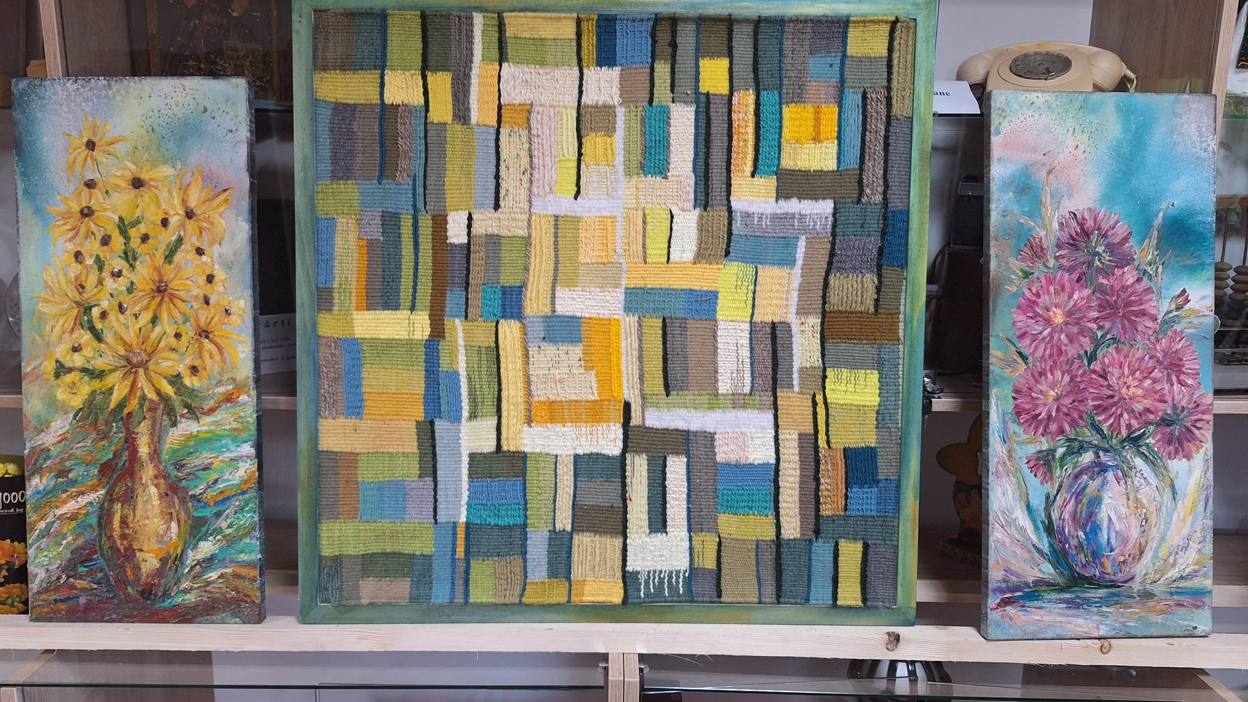 În centru – tapiseria „Fotoni sub tei”. Prin părți – picturi în ulei pe pânză.